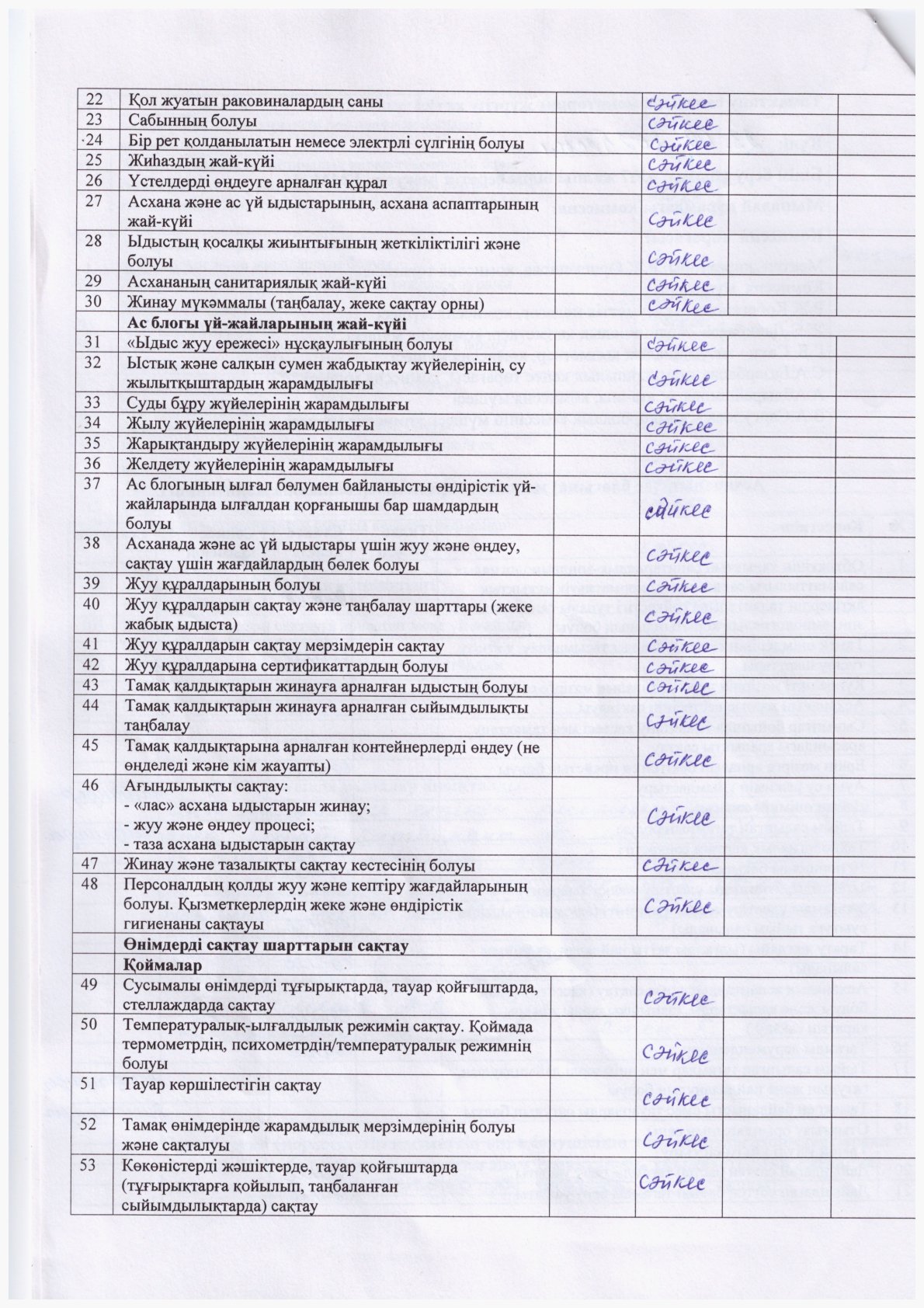 05.04.2019 жыл күні Мектеп директоры Қ.Нурбаева және комиссия мүшелері мен бірге ҚР Денсаулық сақтау министрінің 16.08.2017ж №611 бұйрығын негізге ала отырып, асханаға тексеру жұмыстарын жүргізді. Ас мәзірімен асхананың санитариялық талаптарға сәйкестігі, асхана қызметкерлерінің қызмет көрсету барысы мен сапасы, шикізаттың жеткілікті қолданылуы, дайын астың сапасын бақылайтын бракераждық журналдың уақытында толтырылуын , бекітілген мәзір бойынша дайын ас көлемінің сәйкестігі қаралды. Мектеп медбикесімен бірге ас сақтайтын қоймаларды және тоңазытқыштарды тексерді.