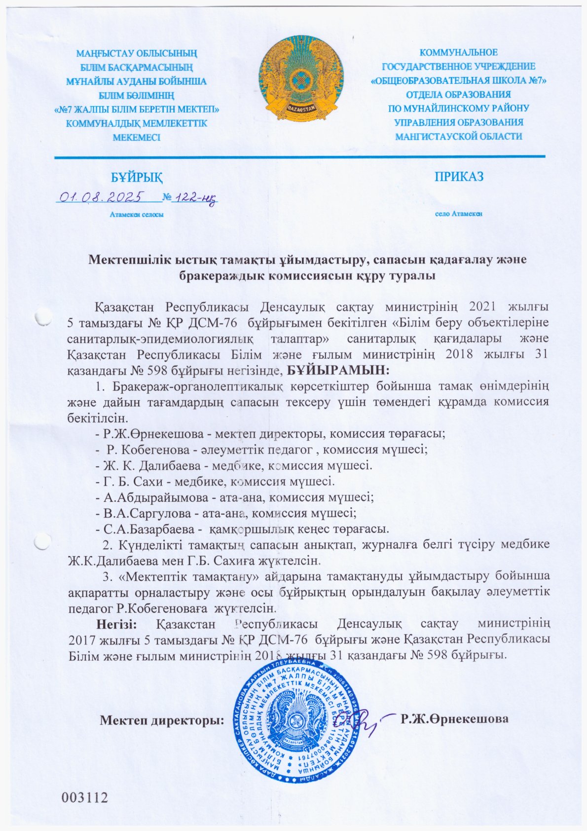 "Мектепішілік ыстық тамақты ұйымдастыру, сапасын қадағалау және бракераждық комиссиясын құру туралы бұйрық"