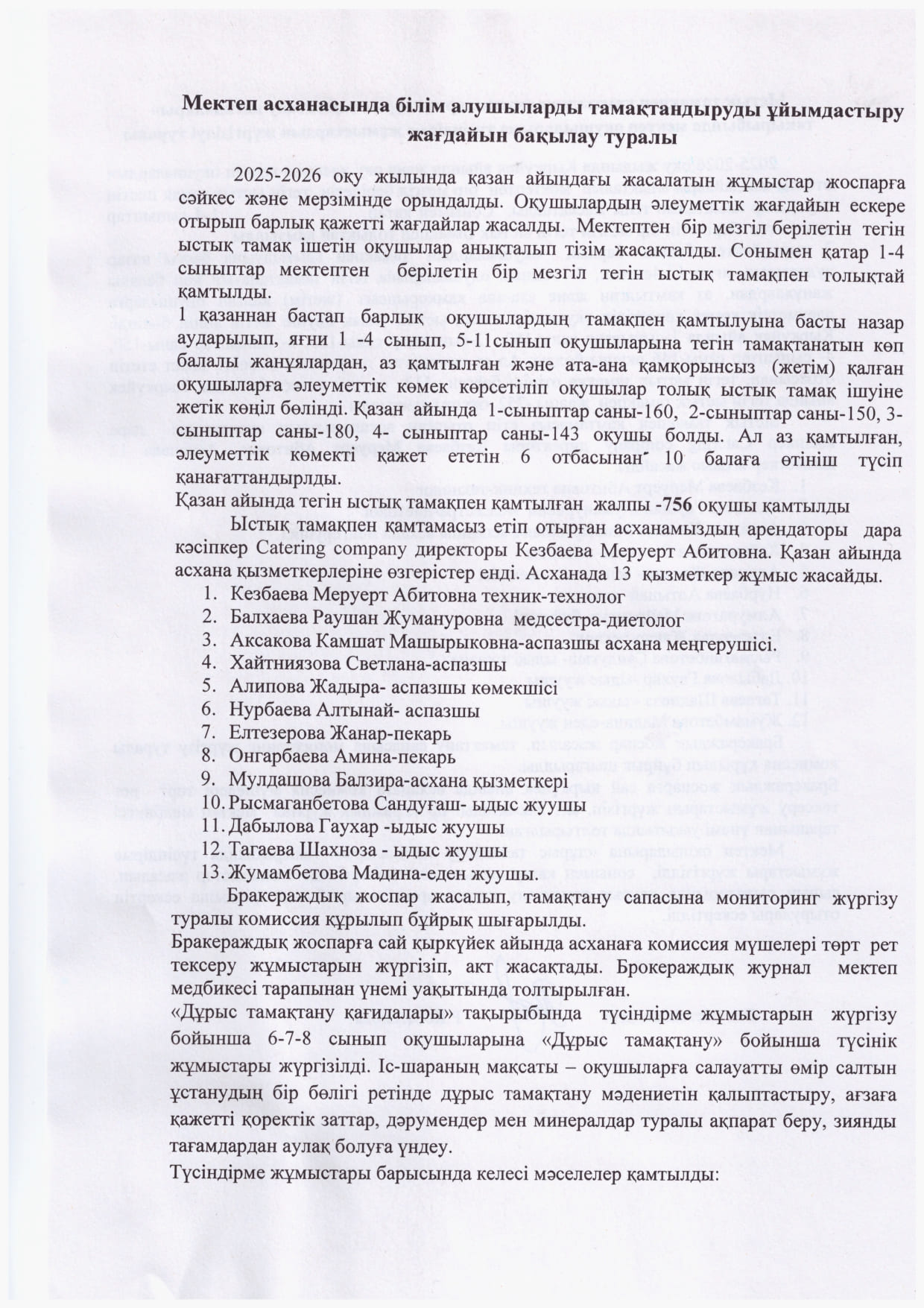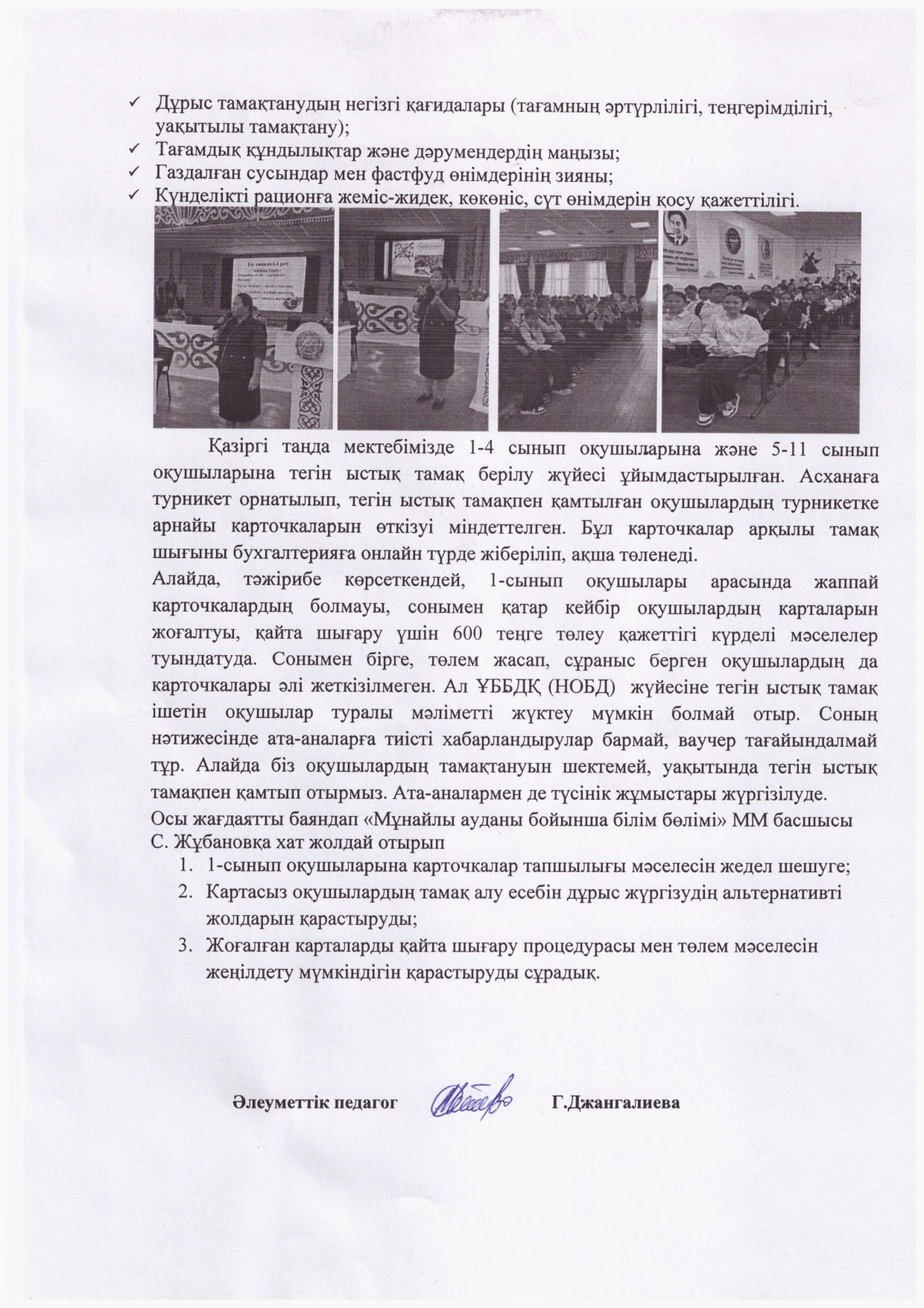 1 қыркүйектен бастап барлық оқушылардың тамақпен қамтылуына басты назар аударып, яғни 1 сынып, 2-4сынып, 5-11сынып оқушыларына тегін тамақтанатын көп балалы жанұялардан, аз қамтылған және ата-ана қамқорынсыз (жетім) қалған оқушыларға әлеуметтік көмек көрсетіліп оқушылар толық ыстық тамақ ішуіне жетік көңіл бөлінді.