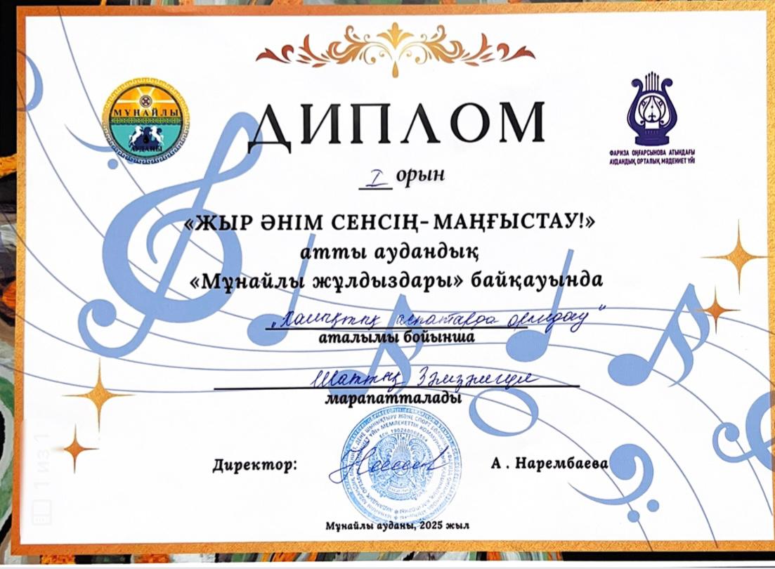 "ЖЫР ӘНІМ СЕНСІҢ-МАҢҒЫСТАУ!" атты аудандық "Мұнайлы жұлдыздары" байқауында "Халықтық аспаптарда орындау" аталымы бойынша І орын иеленген ШАТТЫҚ ЗӘМЗӘМГҮЛ марапатталды.