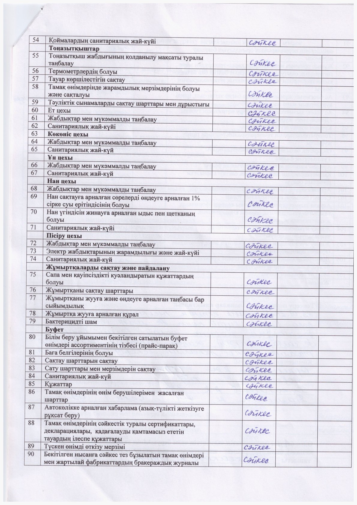 05.04.2019 жыл күні Мектеп директоры Қ.Нурбаева және комиссия мүшелері мен бірге ҚР Денсаулық сақтау министрінің 16.08.2017ж №611 бұйрығын негізге ала отырып, асханаға тексеру жұмыстарын жүргізді. Ас мәзірімен асхананың санитариялық талаптарға сәйкестігі, асхана қызметкерлерінің қызмет көрсету барысы мен сапасы, шикізаттың жеткілікті қолданылуы, дайын астың сапасын бақылайтын бракераждық журналдың уақытында толтырылуын , бекітілген мәзір бойынша дайын ас көлемінің сәйкестігі қаралды. Мектеп медбикесімен бірге ас сақтайтын қоймаларды және тоңазытқыштарды тексерді.