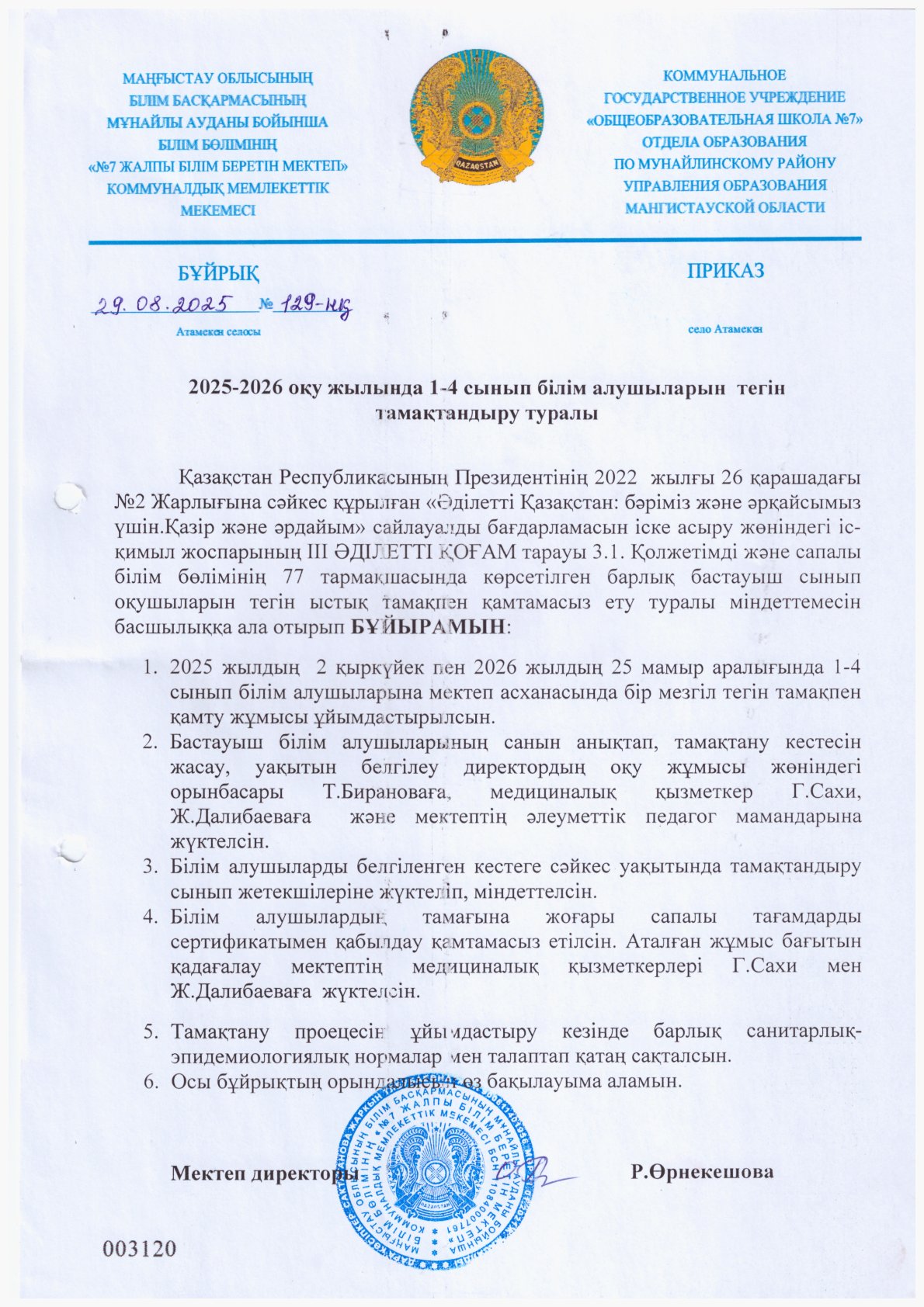 "Мектепішілік ыстық тамақты ұйымдастыру, сапасын қадағалау және бракераждық комиссиясын құру туралы бұйрық"
