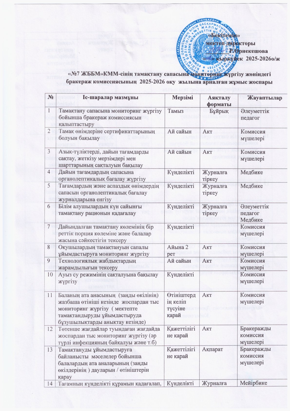 "№7 ЖББМ" КММ-нің тамақтану сапасына мониторинг жүргізу жөніндегі бракераж комиссиясының 2024-2025 оқу жылына арналған жұмыс жоспары
