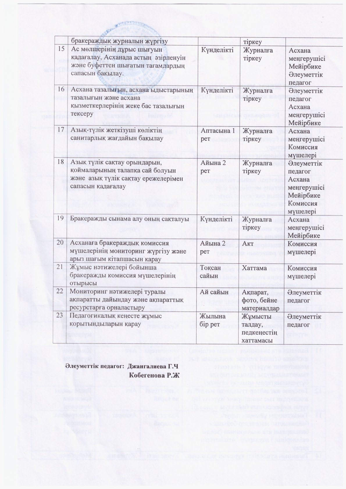 «№7 ЖББМ»КММ -сінің Тамақатану сапасына мониторинг жүргізу жөніндегі бракераж комиссиясының 2023-2024 оқу жылына арналған жұмыс жоспары