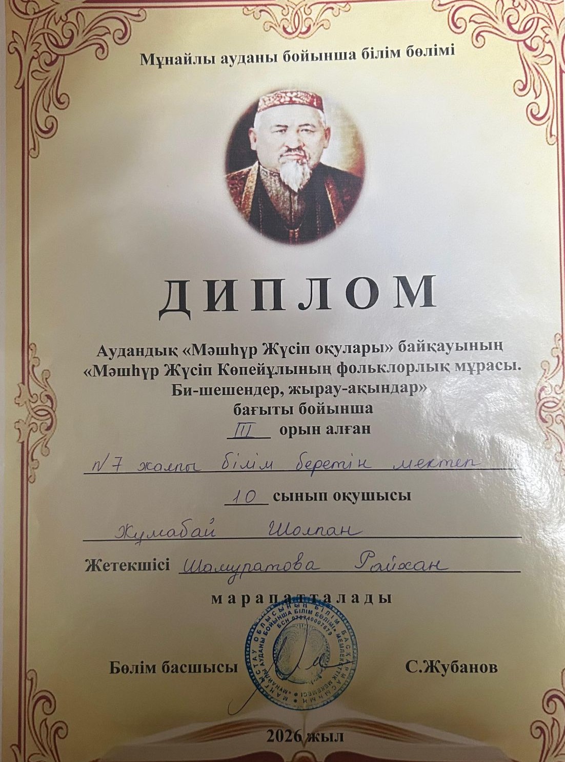 Республикалық “Мәшһүр Жүсіп оқулары байқауының “Мәшһүр Жүсіп Көпейұлының фольклорлық мұрасы. Би-шешендер, жырау-ақындар” бағыты бойынша III орын алған 10 сынып оқушысы Жұмабай Шолпан марапатталды